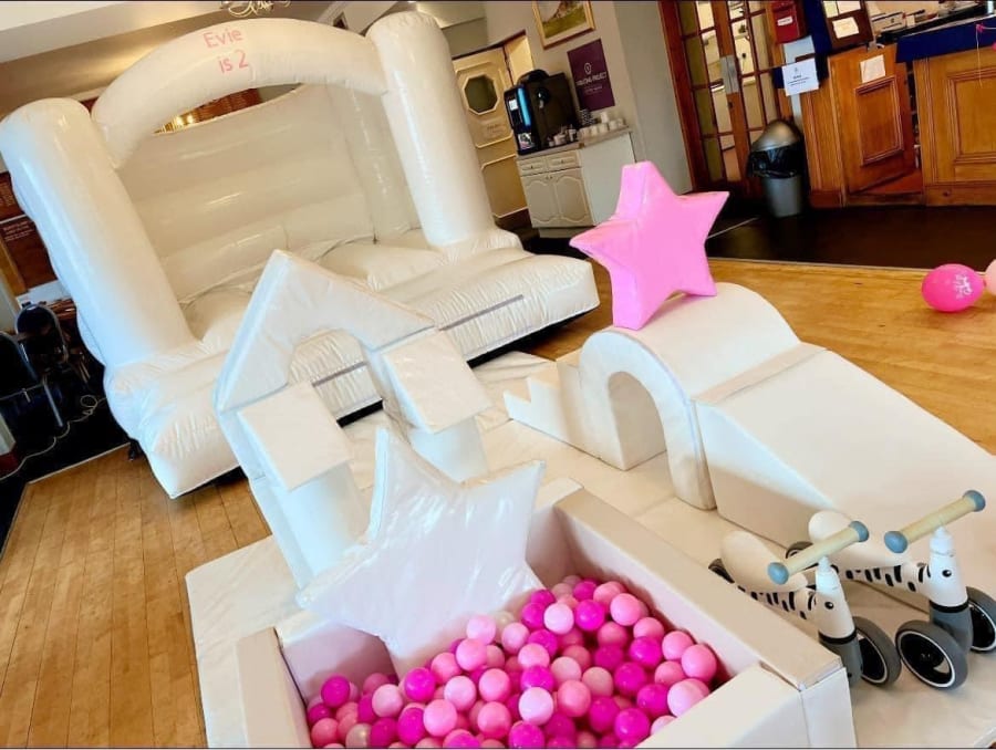 White Party Package offers a low height bouncy castle perfect for venues with lower height ceilings