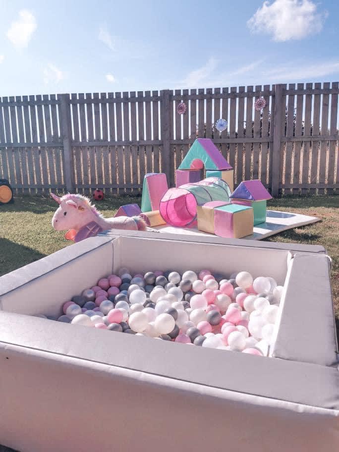 The pastel soft play set includes a 11 piece castle block set, a step and slide, a 4ft x 4ft ball pool, animal hoppers or some ride on toys.