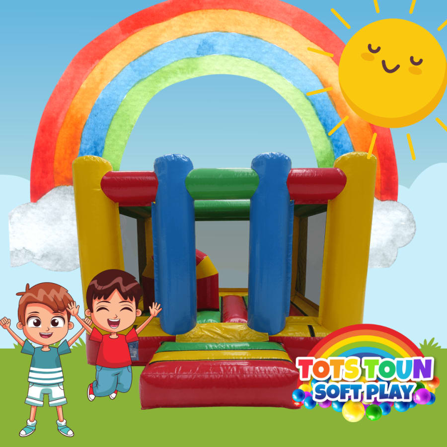 Our Rainbow Bouncy Castle is designed to accommodate the energy and enthusiasm of children up to the age of 9. Its compact yet spacious layout allows for hours of bouncing fun. It goes perfectly with our Rainbow inflatable slide and Toddler time soft play.