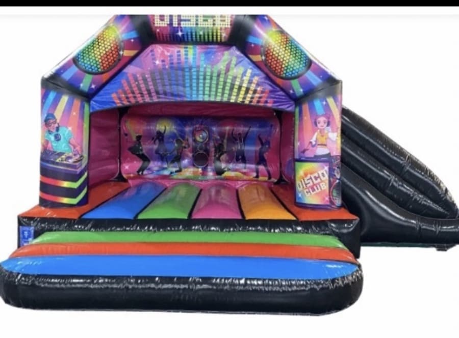 The 13ft x 18ft Disco castle . upbeat design, and a roomy bounce area make this Disco Bouncy Castle a showstopper. Ideal for birthdays, school fairs, and community events. Safe. Durable. Fun. βœ¨πŸ•Ί