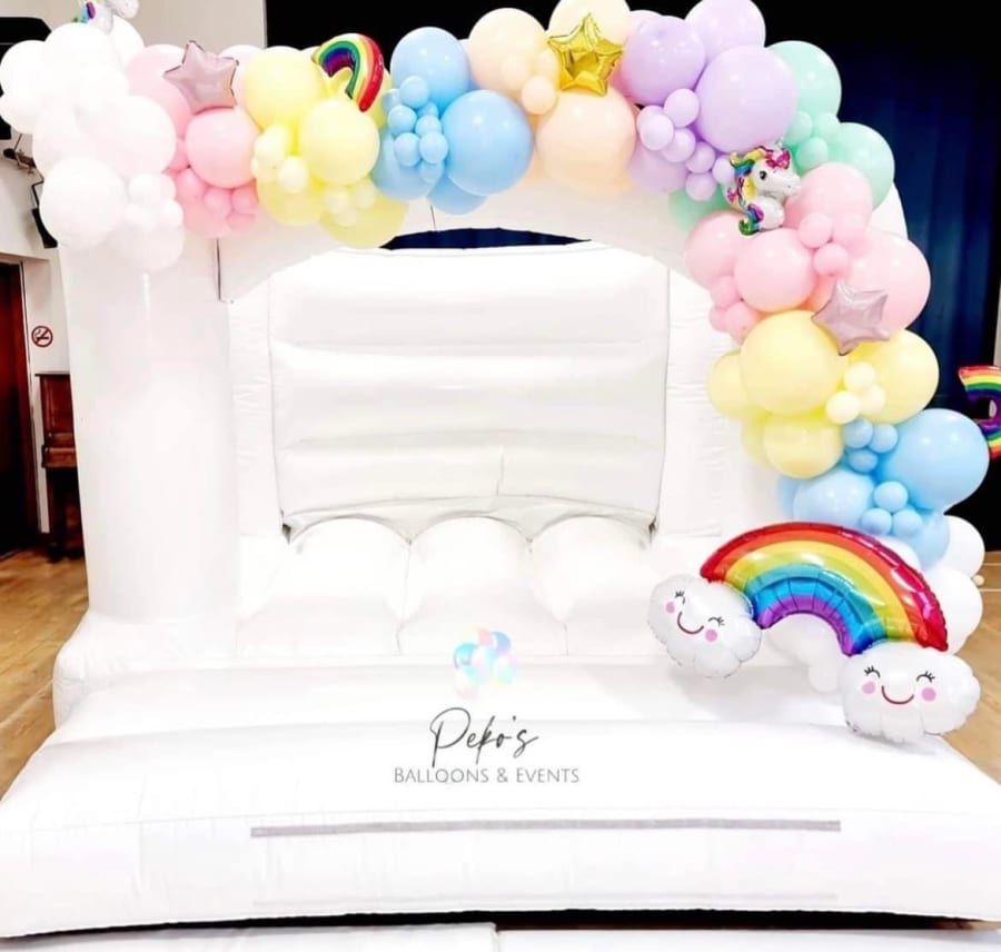 Want to match the bouncy castle to your party theme? No problem! Our White Bouncy Castle can be easily decorated with balloons and vinyl, allowing you to create an atmosphere that complements your event. Whether it's a princess-themed party or a superhero extravaganza, this bouncy castle will fit right in. We have an in-house design team that thrive on bringing your vision to life, Contact Tots Toun Soft Play and have a look at our Corporate Branding Fife