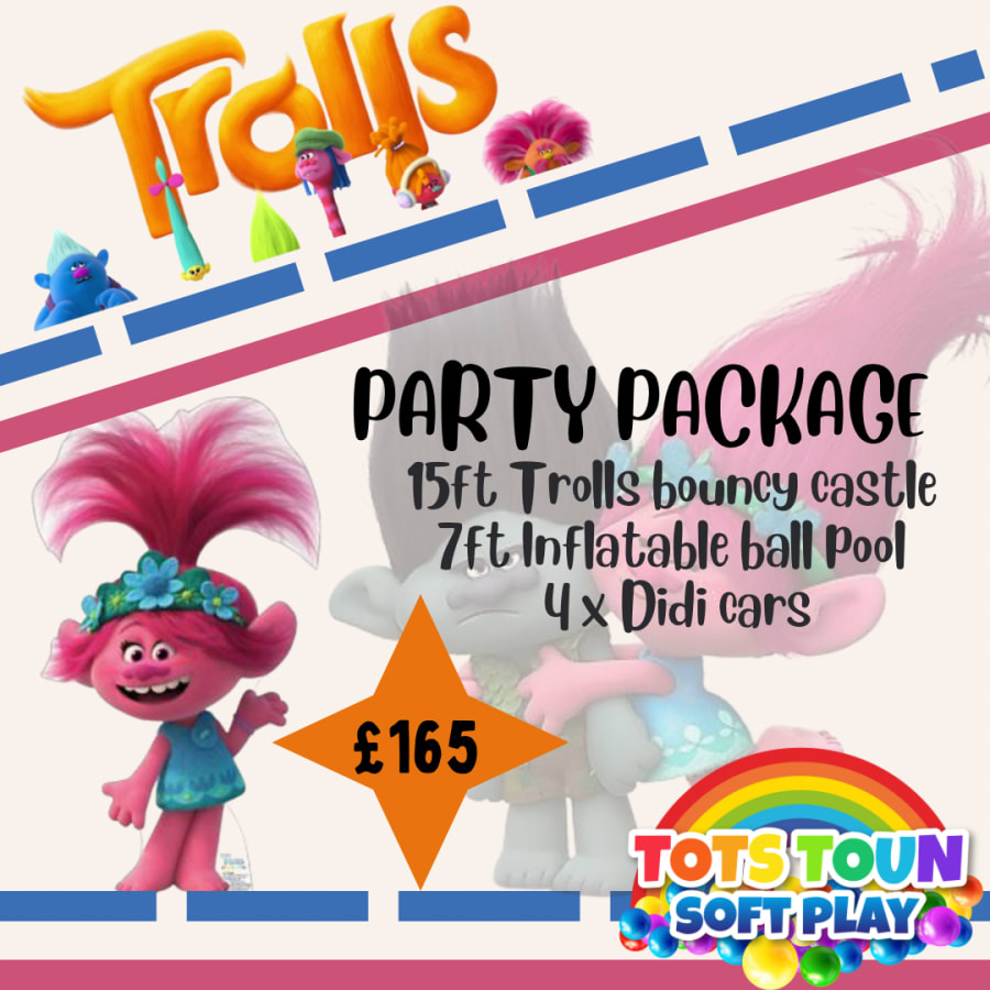 Party package- packed full of fun with a Trolls bouncy castle, 7ft inflatable ball pool and 4 super cool Didi cars this package is perfect for a busy party.